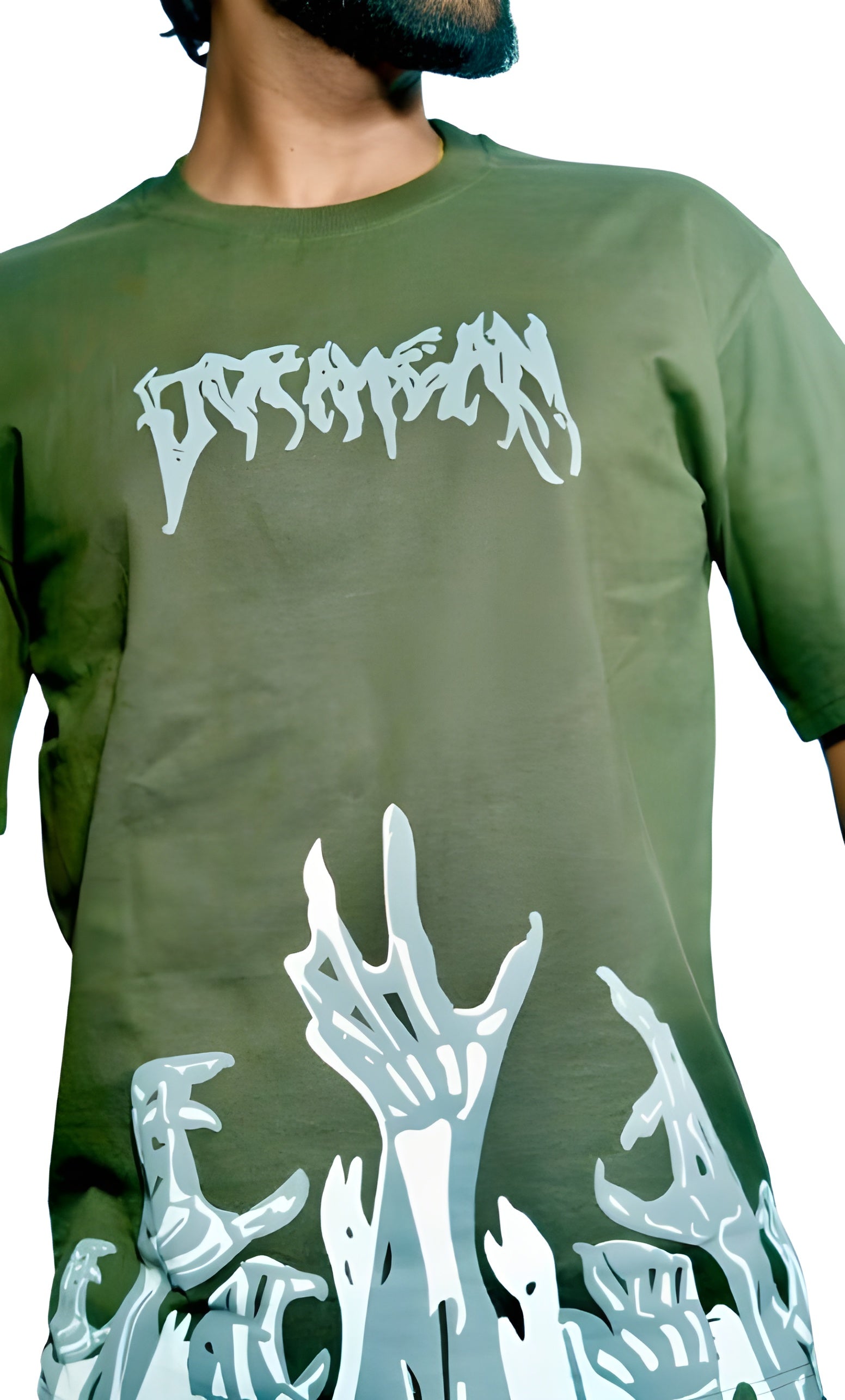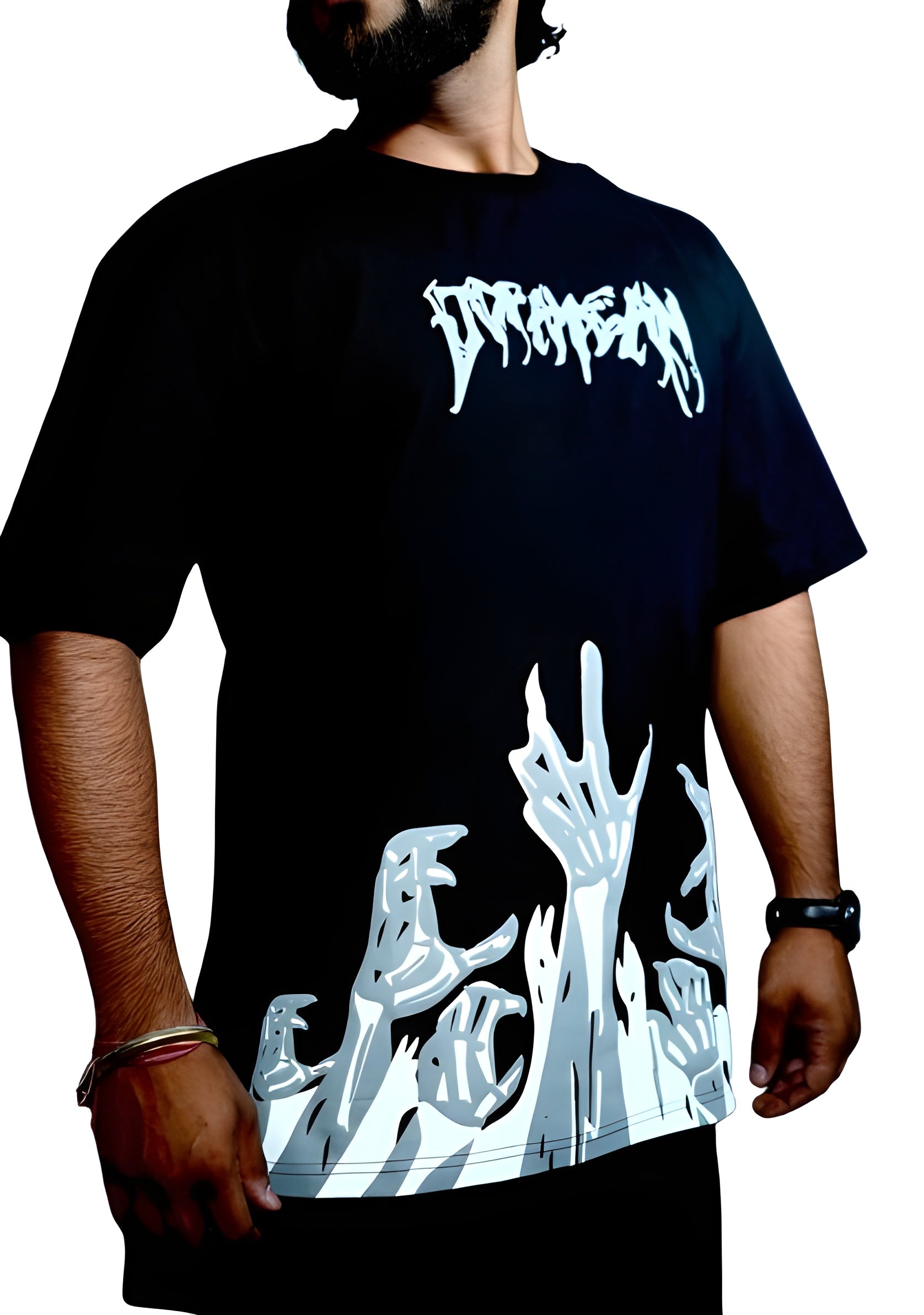A scream from beneath. This 240 GSM oversized cotton terry tee features a chilling lower-hem graphic of skeletal hands rising from the depths—grasping, clawing, and reaching into our world. Paired with a dripping graffiti-style chest logo, this piece embodies rebellion and unrest.