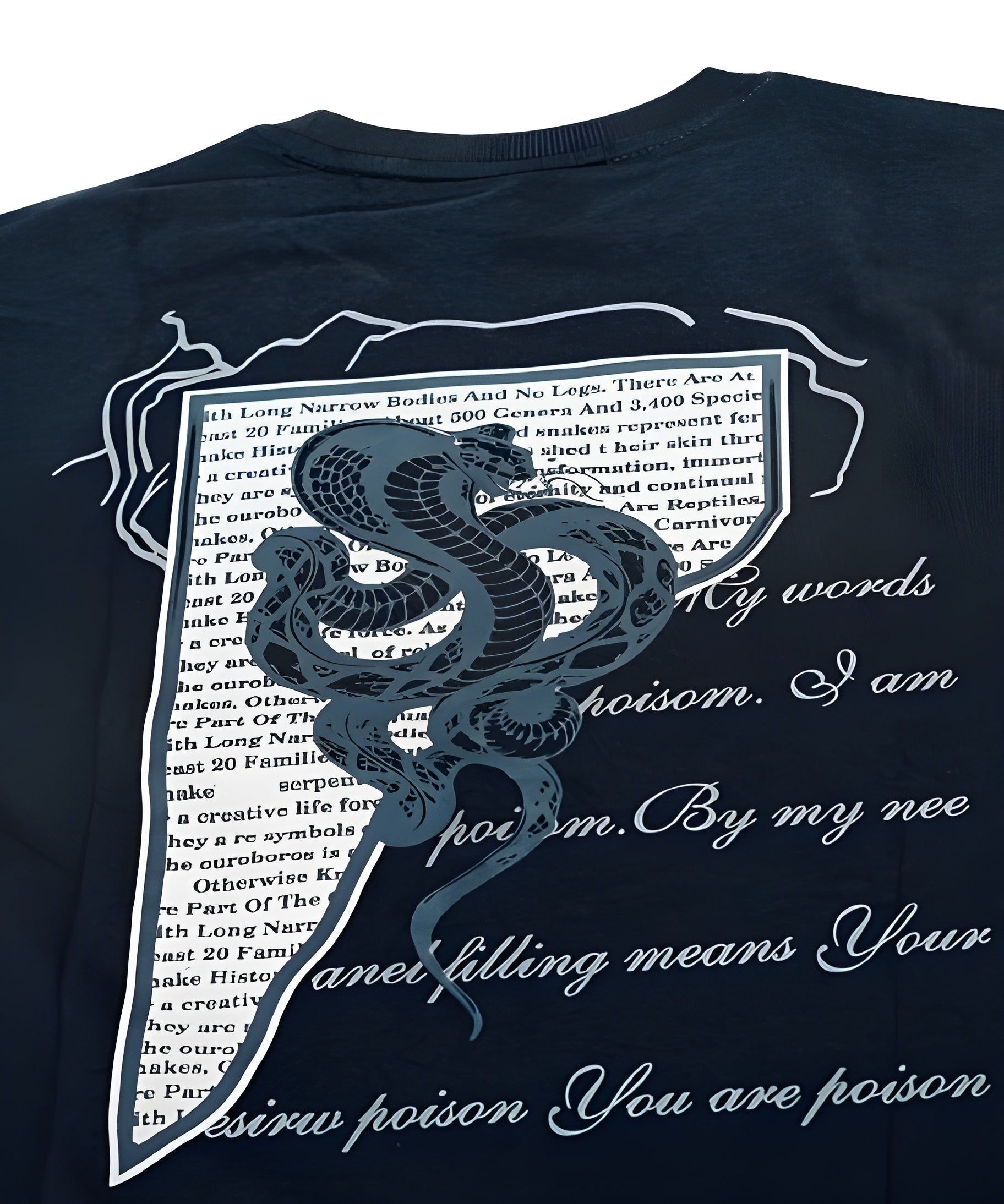Deadly elegance meets poetic destruction. The VENOM VERSE tee fuses coiled serpents with cryptic, layered typography, blending mythology, poison, and power into a statement streetwear piece. The text bleeds across the back, interrupted by a venomous snake slithering through fragmented narratives.